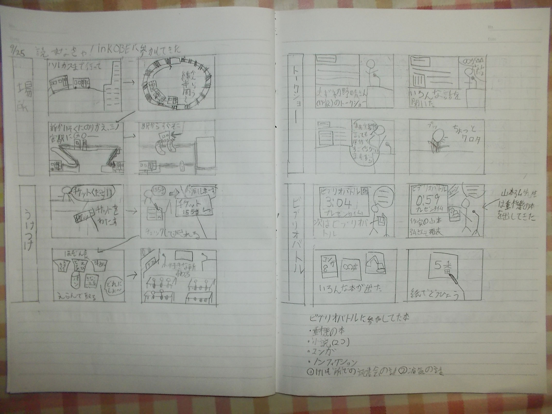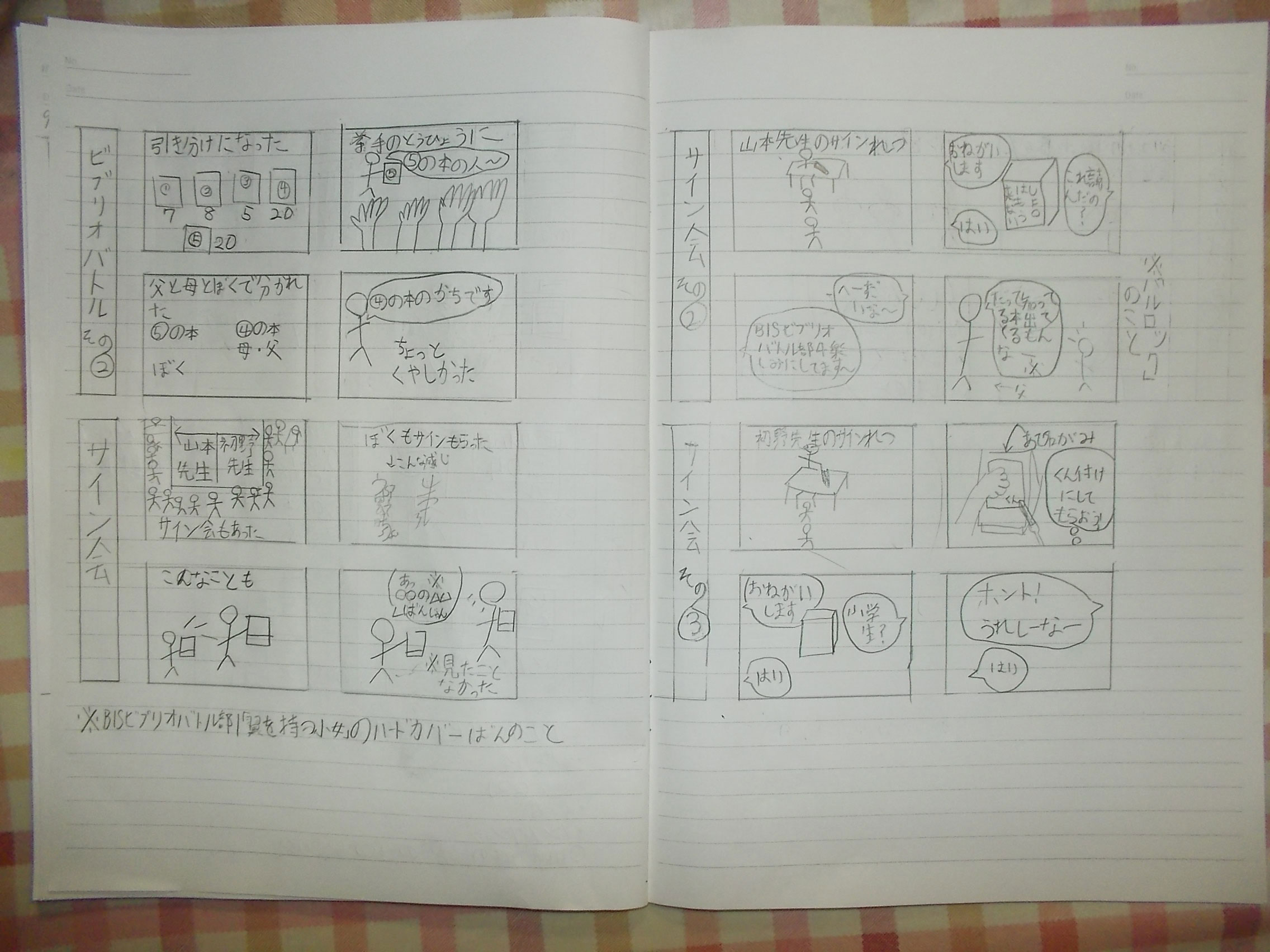 そして今回、小学五年生の生徒さんがご両親と一緒に参加してくれたのですが(小学生の参加は初めてです)、終了後に素敵な「絵日記」をいただきましたので、親御さんのお許しを得て次ページに一部を転載させていただきます。小学生にして山本弘さんのファンだそうです。たっぷりと楽しんでくれたようで、何よりでした! また来てくださいね!