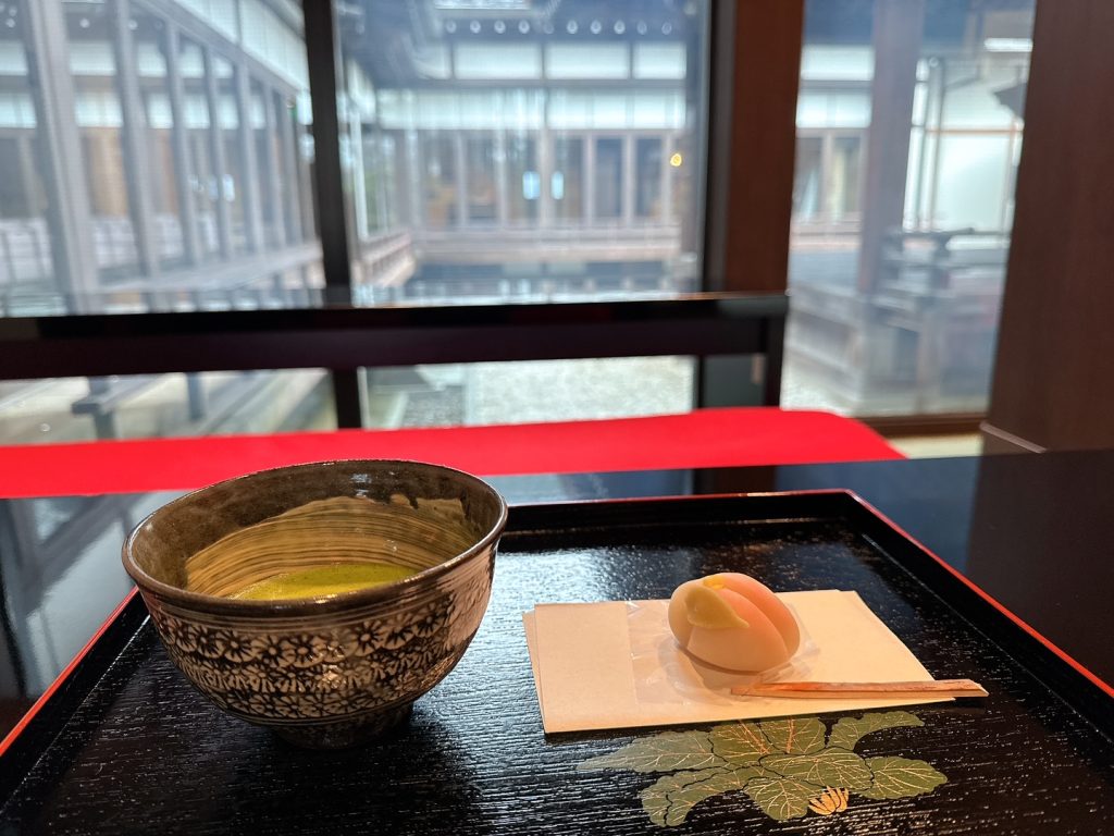館内にはお茶とお菓子をいただけるコーナーもあり、彦根城の天守閣まで上がっていく前に、ちょっと休憩もよろしいかと。この日は雨模様で、中庭の能舞台も雨のなか、しっとりしておりました。